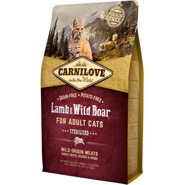 Složení: kančí masová moučka (35%), jehněčí z volného chovu (24%), žlutý hrách (19%), kuřecí tuk (chráněno tokoferoly, 6%), jablka (4%), kuřecí játra (3%), tapiokový škrob (3%), lososový olej (2%), mrkev (1%), lněné semínko (1%), cizrna (1%), hydrolyzované skořápky korýšů (zdroj glukosaminu, 0,026%), extrakt z chrupavek (zdroj chondroitinu, 0,016%), pivovarské kvasnice (zdroj mannan-oligosacharidů, 0,016%), kořen z čekanky (zdroj frukto-oligosacharidů, 0,012%), juka schidigera (0,01%), mořská řasa (0,01%), psyllium (0,01%), tymián (0,01%), rozmarýn (0,01%), oregano (0,01%), brusinky (0,0008%), borůvky (0,0008%), maliny (0,0008%).