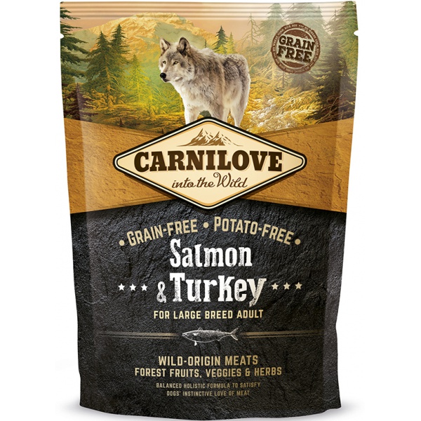 Carnilove Salmon & Turkey for Large Breed Adult je navržen v souladu s respektem k původní přirozené potravě psů. Z velké části ji tvoří ulovená kořist – svalovina, vnitřnosti a kosti, doplněná o správný poměr ovoce, zeleniny a bylin
